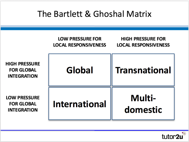 The Bartlett & Ghoshal Model indicates the strategic options for businesses wanting to manage their international operations based on two pressures: local responsiveness and global integration.